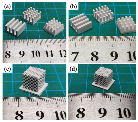 Complex-shaped Al2O3-AlN composites ceramic components were fabricated via DLP with the optimized AlN content and sintering temperature. The green bodies of ceramic radiators with different shapes and lattice structures are presented in Figure 9a,c. The sintering bodies are shown in Figure 9b,d. The green and sintering bodies show great surface quality and no significant geometric deformation. The shrinkage of the samples after sintering in the x, y, and z directions reached 20.25%, 20.34%, and 21.38%, respectively. Complex-shaped and high-precision ceramics components, with 15 wt% AlN addition, are able to be fabricated by DLP and achieve high bending strength and high thermal conductivity.