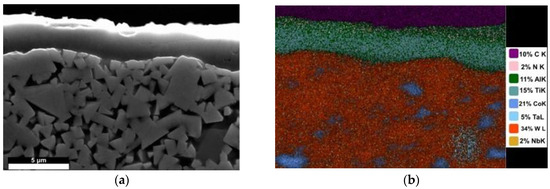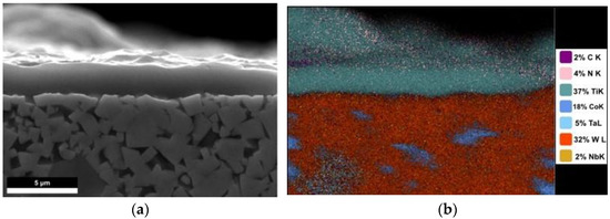 The microstructures of the top surfaces of the coatings and of the cross sections through cutting tools were observed with a QUANTA 450 FEG (FEI, Hillsboro, OR, USA) scanning electron microscope while the elemental distributions (mapping and local analysis) were performed with the EDS-EDAX (FEI, Hillsboro, OR, USA) unit of the same equipment. The SEM images support the adhesion qualitatively appraisal, i.e., the intimate contact between the coating and the substrate.