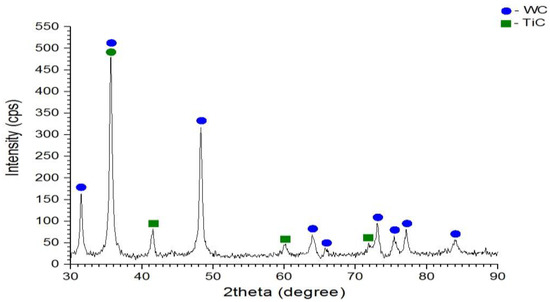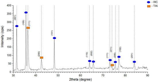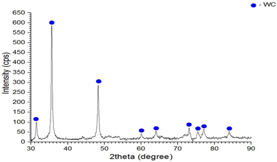 The XRD pattern of the blank WC substrate, e.g., without grain growth inhibitors (TiC, TaC, and NbC) addition (Figure 3) shows only the peaks assigned to the WC phase (ICDD card No. 03-1096).