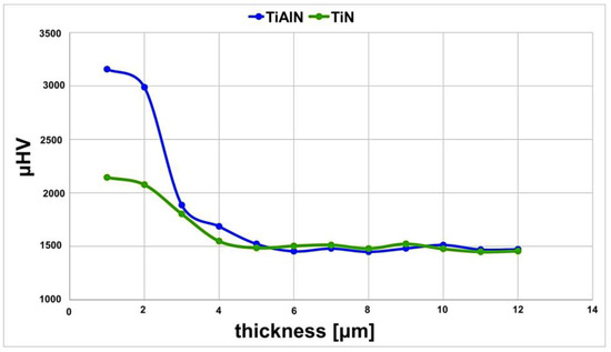 Microhardness profiles across the TiN and TiAlN coatings and substrates.