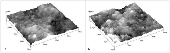 A Quesant Q-Scope 350 AFM (Ambious Scan Atomic V.5.0.0, Toronto, ON, Canada) operated in (tapping mode) was used to investigate the roughness of the TiN and TiAlN coatings. The scanned area was 40 × 40 μm2 for all the measurements. The Ra and Rq parameters were calculated using the equipment software.