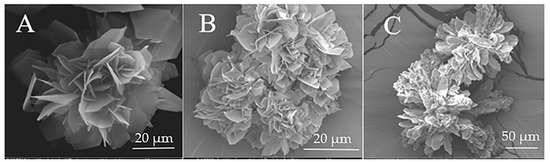 L-glu was crystallized with and without ion additives in order to study the effect of ions on the L-glu crystallization. Figure 1A displays L-glu crystallized in a water–ethanol mixture without additives. As is evident, L-glu crystallizes in very thin plates (ca. 20 µm in length, 250 nm thickness) which together form a flower-like structure. Figure 1B,C show images of L-glu crystallized using sodium and potassium cations, respectively. There is no change in the morphology of L-glu crystallized with sodium ions and there is a small morphological change for L-glu crystallized with potassium ions. The structure is still flower-like. However, the plates making up the flowers are elongated compared to L-glu plates crystallized without ions.