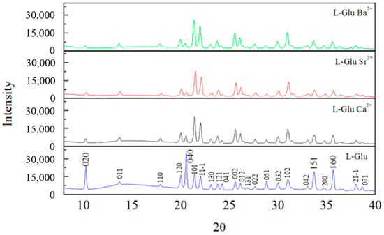 XRD spectra of L-glu crystallized without ions and with barium, strontium and calcium ions are shown in Figure 4. It is evident that the same crystal structure is shown in all spectra. The crystal structure belongs to β-L-glu.