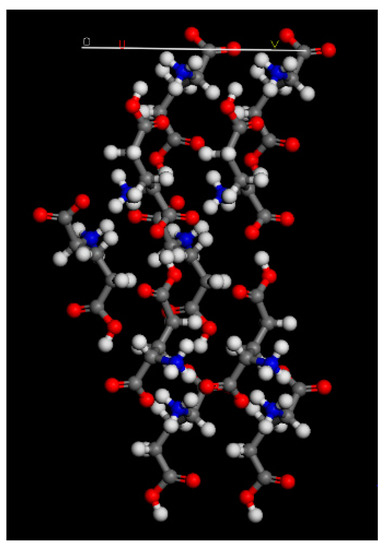 Comparing the XRD spectra, it is evident that the addition of ions to the crystallization of L-glu has a major impact on the (020) and (040) peaks. These peaks are markedly reduced in the spectra of L-glu crystallized with ions compared to the L-glu spectrum. The peak intensity reduction is identical for all ions, meaning that the barium, strontium and calcium ions affect the L-glu in the same way. Materials Studio 4.4 software was used in order to model the (020) L-glu plane—Figure 5. It is evident from Figure 5 that carboxylic groups are found protruding from the plane. The carboxylic groups found at the plane add insight to the reason for the reduction of the (020) and (040) peaks. Reduction of the peaks can be caused by electrostatic interactions between the ions and the carboxylic groups. Furthermore, there is also a reduction in the (151) and (160) peaks. In this case, carboxylic groups are partially exposed at the planes and therefore, the electrostatic interactions are weaker. These findings are in line with previous studies by Colfen et al.