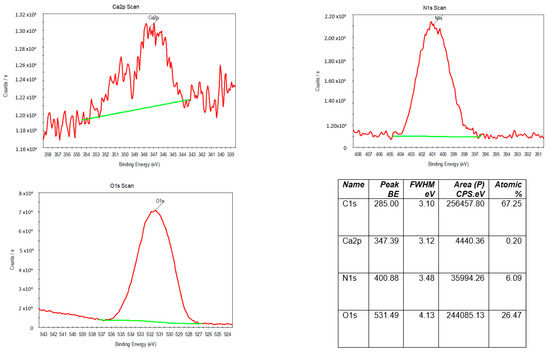 In order to confirm the presence of the Ca2+ ion in the spherical L-glu structures, L-glu spheres crystallized from 54 mM L-glutamic acid and 11 mM Ca2+ ions were measured by X-ray photoelectron spectroscopy. Figure 7 displays XPS images of the hierarchical spheres. As can be seen, the XPS spectra contain carbon C1s, nitrogen N1s and oxygen O1s peaks, typical of L-glu a. In addition, the spectra also contain a calcium 2p peak, confirming the presence of calcium in the L-glu spheres.