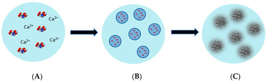 Proposed mechanism: (A) = L-glu and the inorganic additive are dissolved in water, (B) = a quasi-emulsion of drops of water of L-glu and the inorganic additives in ethanol, (C) = crystallization of L-glu inside the emulsion droplets.