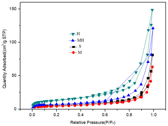 The analysis results of the surface structure of the sample are shown in Table 2 and Figure 5. Compared with those of the S sample, the specific surface area and pore volume of the M soil were lower, whereas those of the H soil were higher at 65.8 m2/g and 0.33 mL/g, respectively. The specific surface area of the MH sample slightly increased, whereas the pore volume significantly increased from 0.09 mL/g to 0.19 mL/g.