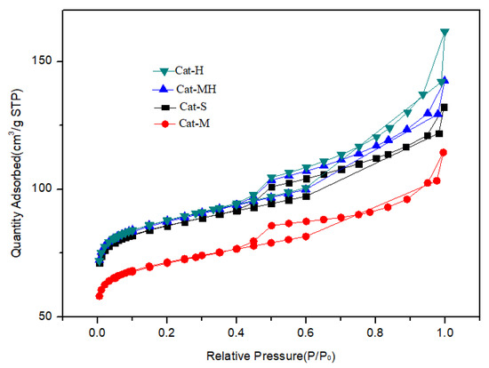 For the results of the surface structure analysis of the catalysts, the N2 adsorption curves of the catalyst samples exhibited the same trend as that of the support material, kaolin. Compared with those of CAT-M, the specific surface area, matrix area, pore volume, and mesoporous volume of CAT-MH and CAT-H were higher, and those of CAT-S were similar to those of CAT-MH. The reason is that the addition of tubular halloysite as the support material increased the specific surface area, matrix area, pore volume, and mesoporous volume of the catalyst under the premise that the other raw materials remained the same.