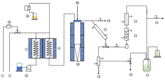 Flow chart of small fixed-fluidized bed catalytic cracking test unit. ① Oxygen. ② Air. ③ Flow meter. ④ Oil pump. ⑤ Gasifier. ⑥ Preheating oven. ⑦ Water pump. ⑧ Catalyst inlet. ⑨ Reactor. ⑩ Emergency vent valve. ⑪ Primary condensation. ⑫ Secondary condensation. ⑬ Three-stage condensation. ⑭ Gas products. ⑮ Liquid products. ⑯ Blowoff valve. ⑰ Gas jar.