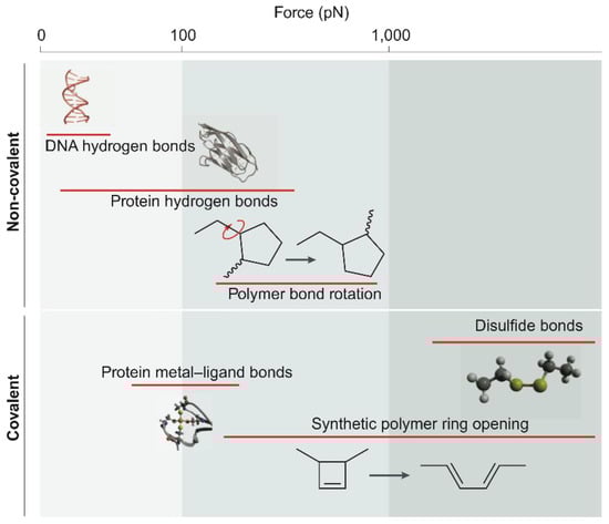 Single molecule force spectroscopy techniques have provided significant insights on the mechanical strengths of chemical bonds [1,17,18], such as the magnitudes of the mechanical forces required to break covalent bonds and non-covalent interactions like hydrogen bonds. Figure 2 shows the orders of magnitude of such forces [18], as determined at the single-molecule level. As intuitively expected, the forces to break covalent bonds are typically higher (reaching the nN order of magnitude), than those to disrupt non-covalent interactions.