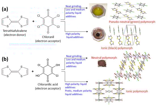 LAG is a demonstrated method for including guests in a previously formed host-guest array; thus, it appears to be a promising method for synthesizing ternary and multicomponent cocrystals [86]. Moreover, the effects of various properties of the LAG liquids in mechanochemical reactions, such as polarity [11], dipole moment, dielectric constant, protic and aprotic character, acidity/basicity, and molecular volume have been explored. The author’s previous work [83,102,103] on organic binary-component charge transfer complexes (CTC) illustrates the effect of the dielectric constant of the liquid additives toward the preferential formation of ionic CTC of tetrathiafulvalene (TTF), an electron donor. Although these reactions using agate mortars and pestles do not qualify for LAG under the previous definition—since in many cases they occurred in pastes that dried during the mechanical treatment—it was systematically found that the most polar solvents facilitated the formation of ionic CTC, including tetrathiafulvalene chloranil (TTF-CA) [102], tetrathiafulvalene 2,3-dichloro-5,6-dicyano-p-benzoquinone (TTF-DDQ, DDQ = 2,3-dichloro-5,6-dicyano-p-benzoquinone) [103], and ionic tetrathiafulvalene chloranilic acid (TTF-CAH2) [83]. Neat grinding or manual grinding with low polarity solvents produced instead a neutral form of TTF-CAH2, pseudo-neutral (green) TTF-CA, and amorphous phases of TTF-DDQ. Selected results are summarized in Figure 3.