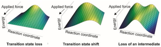 - Roessler, A.G.; Zimmerman, P.M. Examining the Ways to Bend and Break Reaction Pathways Using Mechanochemistry. J. Phys. Chem. C 2018, 122, 6996–7004. [Google Scholar] [CrossRef]