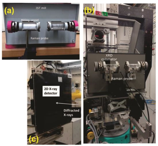 - Batzdorf, L.; Fischer, F.; Wilke, M.; Wenzel, K.J.; Emmerling, F. Direct in Situ Investigation of Milling Reactions Using Combined X-Ray Diffraction and Raman Spectroscopy. Angew. Chem. Int. Ed. 2015, 54, 1799–1802. [Google Scholar] [CrossRef]