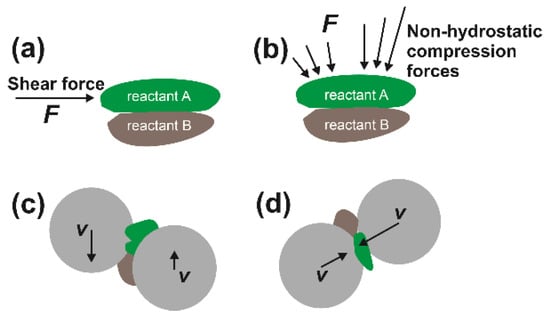 Typical mechanical force types delivering mechanical energy to reactants and inducing mechanochemical reactions. (a) Shear forces lead to surfaces sliding against each other. (b) Non-hydrostatic compression forces anisotropically compress the reactants. The arrows labeled F represent such forces. During ball impacts (in all types of ball mills), mechanical forces, such as (c) shear forces, and (d) non-hydrostatic compression forces, are applied to the reactants at the collision sites, resulting in plastic deformations and the absorption of mechanical energy. The arrows in (c,d) represent the ball’s velocities (v) before impact.