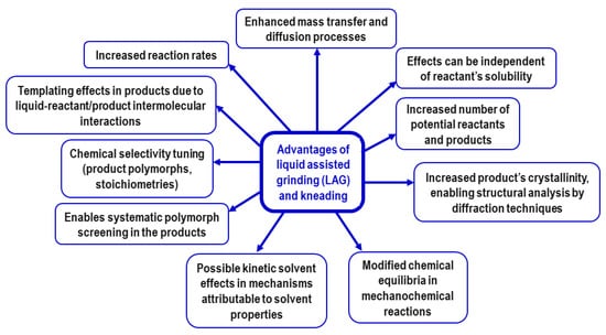 Advantages of using LAG and mechanochemical reactions from pastes (kneading). LAG is defined as the conditions in which the individual effects of the reactant and product solubilities on the reaction are avoided [101].