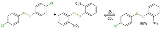 Moreover, the existence of reaction reversibility in covalent mechanochemistry was inferred in the work of Belenguer et al. [109] on the base catalyzed metathesis reaction of symmetric aromatic disulfides substituted in the para position with -nitro, -chloro, and -methyl groups, and with -nitro in the ortho position. In the diluted solutions of all these reactants (after equilibration, since the metathesis reactions are reversible), the reaction products are a mixture of both homodimers and the heterodimer in the statistical 1:1:2 ratio, respectively. Using neat grinding or LAG with acetonitrile, together with 2 mol% of a base (1,8-diazabicyclo[5,4,0]undec-7-ene, dbu) as catalyst, the reaction yielded 98% of the heterodimer (for both neat grinding and LAG), in the case of -nitro in ortho and -chloro in para substitution (see Scheme 5).