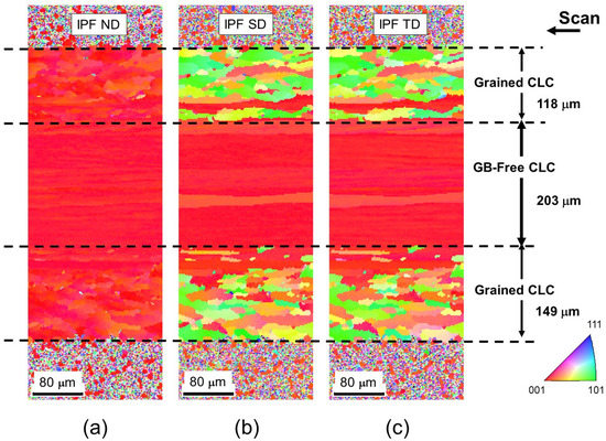 In the outside edges of the 203 μm wide {100}-oriented GB-free region, two grained CLC stripes of 118 or 149 μm in width were observed. The EBSD Inverse Pole Figure (IPF) analysis showed that these side regions also have a {100} orientation in the surface normal direction but comprised many grains with different in-plane orientations of {100}, {310}, {210}, {320}, and {110} in the scan or transverse direction, as shown in Figure 3.