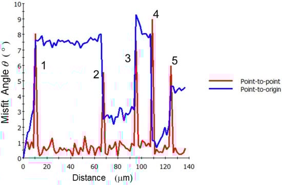 Misfit angle profile along the straight line drawn in Figure 3b. The red line shows the misfit between neighboring measured points, and the blue line shows the misfit of the measured point from the starting point.