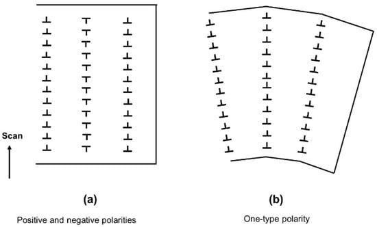 For the sub-B, the crystallographic structure is described by a dislocation array [15,16] because of the small misfit angle of θ < 15°. We have found that there are two types of sub-Bs in the GB-free films. Figure 5 shows schematic views of the tilt boundaries described by the edge dislocation arrays. Figure 5a shows the dislocation arrays in the GB-free film. Neighboring sub-Bs are formed by dislocations with opposite polarities to each other with the same (100) surface normal axis, resulting in almost the same in-plane orientations throughout the film, as shown in Figure 3b,c. If all the sub-Bs comprise dislocations with the same polarities, the orientation in the scan direction of the film bends to one direction by the dislocation arrays, as shown in Figure 5b.