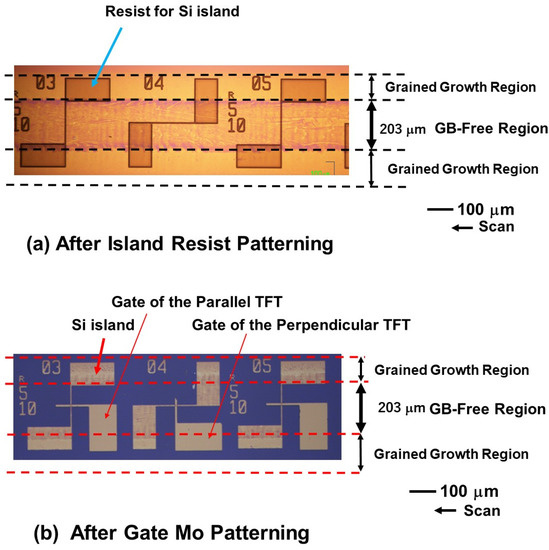Figure 6 shows the TFTs’ alignment to the laser scan: (a) just after the island patterning and (b) after the gate patterning. The parallel and perpendicular TFTs were fabricated alternately in the same laser scan with a period of 412 μm. The channel regions were placed in the GB-free stripe having a 203 μm width. The channel length and width were 10 μm and 5 μm, respectively, for both the parallel and perpendicular TFTs. The n+ wiring and contact regions were placed inside the grained or GB-free CLC stripes with a total 470 μm width. Good contact characteristics were obtained if the contacts were formed inside the grained CLC region. The phosphorus activation was carried out by the solid-phase epitaxial growth from the bottom crystalline Si layer by the 550 °C furnace annealing; the amorphous layer is solely induced by ion implantation near the front surface of the 60 nm Si film.