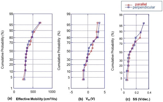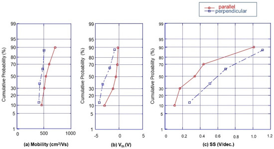 Cumulative distributions of electrical characteristics for the parallel and perpendicular TFTs having channel regions made in GB-free stripes. L = 10 μm, and W = 5 μm. (a) Effective field-effect mobility, (b) threshold voltage Vth (V), and (c) subthreshold swing SS (V/dec).