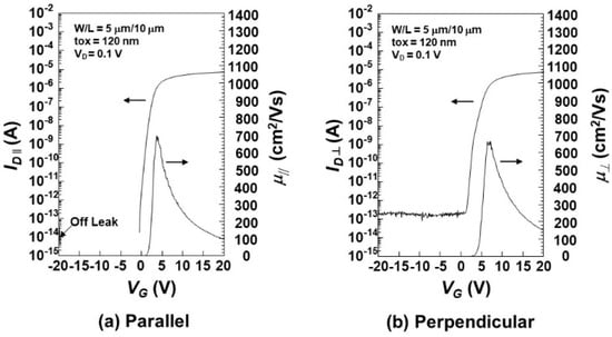 Figure 8 shows the electrical characteristics of the parallel and perpendicular TFTs with the maximum effective mobilities. The maximum mobilities are almost the same between the parallel and perpendicular TFTs; 695 cm2/Vs was obtained for the parallel TFT, and 663 cm2/Vs was obtained for the perpendicular TFT. The steep peak observed in the μ–VG curve is similar to the conventional MOSFETs [26,27,28]. The ID–VG curve becomes steeper when the low substrate impurity concentration becomes low following the universal curve [26,27] and when the trap-state density in the boundary becomes low [28].