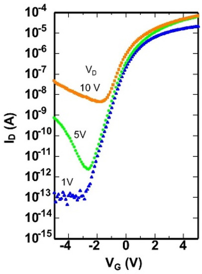 Figure 10 shows the drain leakage current dependence on the drain voltage. The drain leakage current increases with the increasing drain voltage VD. This increase shows the usual leakage current characteristics due to the band-to-band tunneling current at the drain. This tendency also confirms that the small leakage current observed at the VD from −15 V to −5 V is not due to the current inversion. Figure 11 shows the drain current ID versus drain voltage VD characteristics. No anomaly is observed in these characteristics.