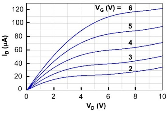 Drain current ID versus gate voltage VG characteristics as a function of the drain voltage VD. Parallel TFT. μ ‖ = 710 cm2/Vs.