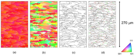 EBSD maps of a grained CLC film. (a) IPF-ND map, (b) IPF-SD map, (c) grain boundaries (15° < θ < 65°), and (d) sub-boundaries (−: 2° < θ < 5°, −: 5° < θ < 10°, and −: 10° < θ < 15°) and grain boundaries (−: 15° < θ < 65°). Power was 4.0 W, and the scan velocity was 12 mm/s.