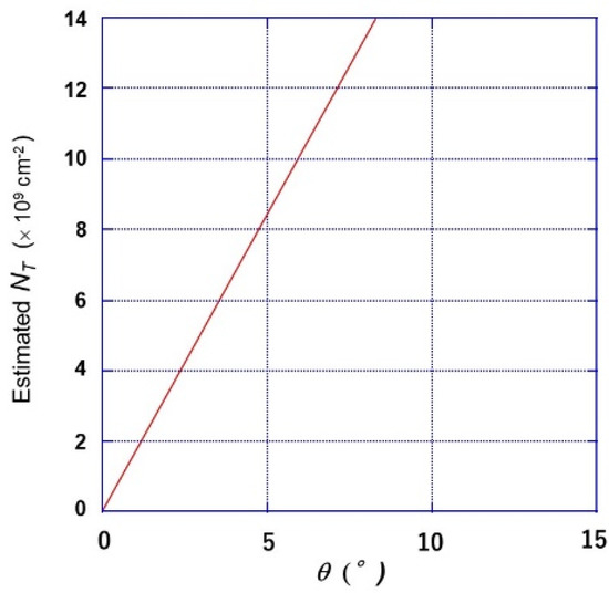 We estimate η as 1 × 10−4, similar to the ratio of the experimentally measured state density to the calculated dangling bond density at the Si–SiO2 interface of the bulk MOSFETs. The interface state density Qss was measured as 6 × 1010 cm−2 for the (100) surface [29], and the number of the calculated dangling bonds is 6.8 × 1014 cm−2 for the (100) surface [30]. The NT obtained from Equations (6) and (7) is proportional to θ, as shown in Figure 16. The effect of sub-B on the TFT characteristics decreases with the decreasing θ.