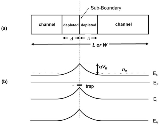 In the sub-G region without sub-Bs, the channel is formed by the gate-induced carriers in the undoped n-channel TFT. We assume that the free carrier is induced with the concentration n0 of 1 × 1016 cm−3 in the inverted channel far from the sub-B, which is compatible with the generally used definition for the inversion layer. As the undoped Si substrate is floating, the electrostatic potential and the carrier concentration are uniform from the front to the back interface. From the symmetry, we treat the effect of the sub-Bs in one dimension with a vertical axis to the sub-B plane. Our model neglects the dislocation core of 0.154 nm thickness because it is very small [31]. The infinitely thin sub-B plane is assumed to have a deep trap with a density of NT. The monoenergetic acceptor-like level is assumed and is ionized when the n-type inversion layer is formed. Due to the charged traps, two depleted regions of Δ are formed at both sides of the sub-B, resulting in a potential barrier of a height qVB, as shown in Figure 17 [32,33,34,35,36,37], where q is the magnitude of electronic charge.