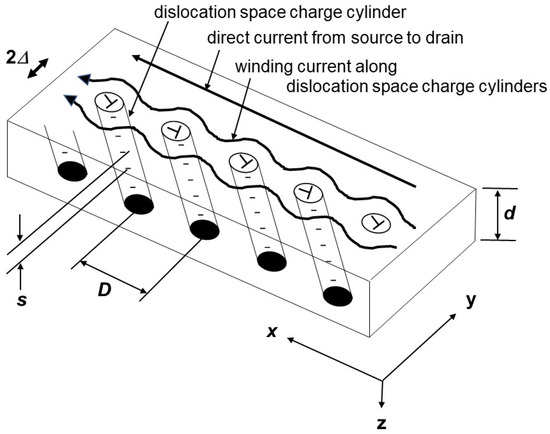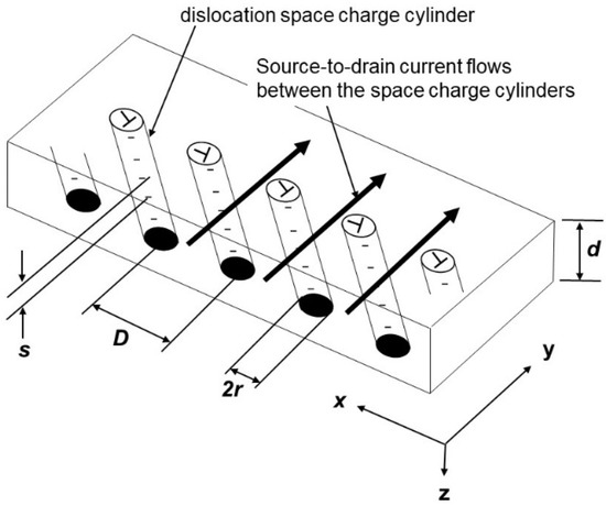 The estimated r is 3.36 nm. This is comparable to the distance D of the dislocations in sub-B; D = 2 ~ 4 nm for θ = 5 ~ 10°, as shown in Figure 15. The carriers can go through the sub-B between the cylinders without the necessity of a high carrier energy surmounting a potential barrier. The dislocation space charge cylinders affect the negligible effect on the current, as concluded in (18), due to only one row of space charge cylinders existing vertically to the current from the source to the drain.