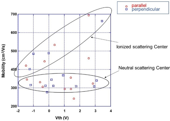 The variations in electrical characteristics shown in Figure 9 are caused by some mechanisms independent of the sub-boundary direction because the distributions of parallel and perpendicular TFTs agree well. Figure 20 shows the correlation between the effective mobility and threshold voltage Vth. The measured points in Figure 20 gather around two clusters: in each cluster, there is no relation between parallel (red circle) and perpendicular (blue square) TFTs. In one cluster, the mobility decreases with the negative shift of Vth. This cluster suggests the mobility reduction due to the scattering by the charged Si–SiO2 interface states at the front or back interface since the negative shift in Vth means an increase in the interface states density Qss. The other cluster shows that the mobility is fixed at a low value, independent of Vth. This suggests that the mobility in this cluster is affected by the neutral scattering centers [41], such as surface roughness, and the effect of the neutral scattering center shields the effect of the Qss fluctuations. The fluctuation of Qss will be suppressed by the optimization of the gate insulator fabrication process at the low temperature of 300 °C. The surface roughness will be suppressed by optimizing the cap structure during the crystallization.