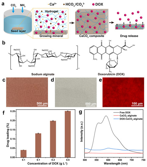 (a) Scheme of the seeded mineralization deployed for the formation of the DOX-CaCO3-alginate composite. (b) Molecular formulae of sodium alginate and DOX. (c,d) Digital photos of DOX-CaCO3-alginate (c) and CaCO3-alginate (d) films. (e) Fluorescence optical microscopic image (green fluorescence with a wavelength of 515–560 nm was used for excitation) of the DOX-CaCO3-alginate film. (f) Correlations between the concentration of DOX in the reacting mother liquors and the drug occlusion levels, where all measurements and calculations were based on the UV-vis spectra and the Beer–Lambert law. (g) Steady state photoluminescent spectra (excitation wavelength = 450 nm) of DOX solution, a CaCO3-alginate film, and a DOX-CaCO3-alginate film.