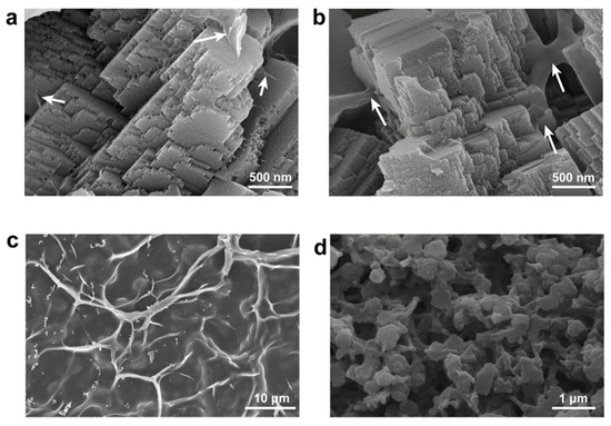 (a,b) Cross-sectional SEM images showing the DOX-CaCO3-alginate (a) and CaCO3-alginate (b) films obtained in 2 wt% alginate hydrogel matrices, where the white arrows point to the gel networks embedded in the lyophilized samples. (c) Top-view SEM image showing the appearance of nanofibrillar networks on the exterior surface of the DOX-CaCO3-alginate overlayers after slight etching with water. (d) SEM image showing DOX powders precipitated in bulk phase.