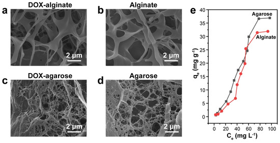 (a,b) SEM images of lyophilized DOX-alginate (a) and alginate (b) hydrogels, where the concentrations of DOX and alginate were 2 g L−1 and 2 wt%, respectively. (c,d) SEM images of lyophilized DOX—agarose (c) and agarose (d) hydrogels, where the concentrations of DOX and agarose were 2 g L−1 and 2 wt%, respectively. (e) Adsorption isotherms of DOX molecules with lyophilized alginate and agarose hydrogels (2 wt%).
