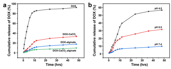 (a) In vitro cumulative release of the DOX components at pH 7.4 using DOX-CaCO3-alginate, DOX- alginate, DOX-CaCO3 composites, and DOX powders. (b) In vitro cumulative DOX release of the DOX components in the DOX-CaCO3-alginate composites at different pH values.