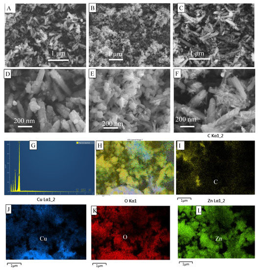 ZnO (A,D), CuO-ZnO, (B,E), and (rGO-ZnO)/CuO (C,F) samples with low and high magnifications; (G) EDS spectrum of (rGO-ZnO)/CuO; (H) layered image; and EDS elemental mappings of: (I) carbon, (J) copper, (K) oxygen, and (L) zinc.