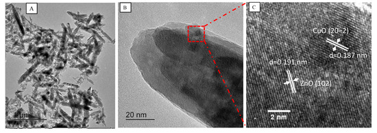 A TEM image of rGO-ZO/CuO samples in Figure 3 illustrates a rod-like morphology that correlates with the SEM image. The rods consist of different sizes with lengths ranging from 230–780 nm and diameters 30–96 nm. The HRTEM image shown in Figure 3 indicates a high degree of crystallinity, as evidenced by lattice fringes [56]. Calculated inter-planar spacings were 0.190 nm, corresponding to between the hexagonal ZnO (102) and 0.187 nm between monoclinic CuO (20-2) planes. The results of this study are consistent with those found in the literature [JCPDS 361451] for ZnO and [JCPDS 481548] for CuO.