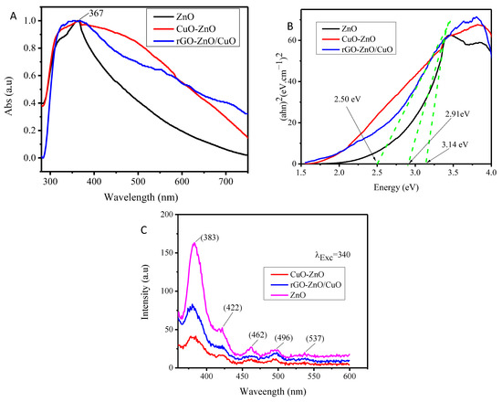 (A) UV–vis absorbance spectra, (B) Tauc’s plot, and (C) PL spectra of ZnO, CuO-ZnO, and (rGO-ZnO)/CuO samples.