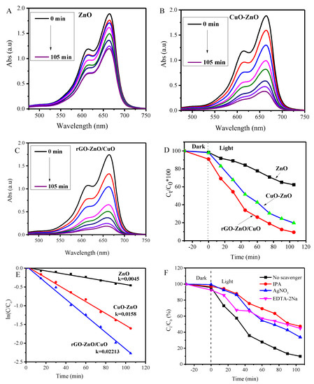 Photocatalytic degradation of MB using catalysts: ZnO NRs (A), CuO-ZnO NCs (B), and (rGO-ZnO)/CuO NCs (C); (D) plots of Ct/C0 vs. reaction time (min); (E) plots of ln(Ct/C0) vs. reaction time (min) for MB degradation using ZnO, CuO-ZnO, and (rGO-ZnO)/CuO NCs; (F) effect of scavengers on the photocatalytic degradation of MB using (rGO-ZnO)/CuO NCs.