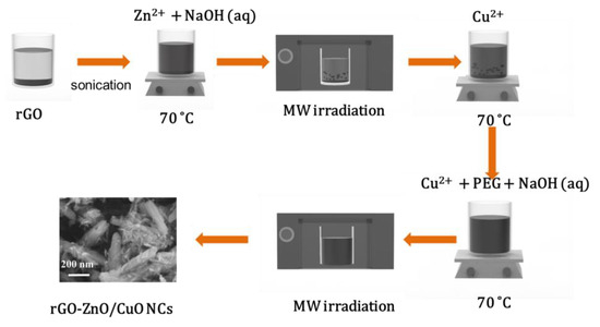 Diagrammatic illustration of (rGO-ZnO)/CuO NCs synthesis by MW-assisted method.