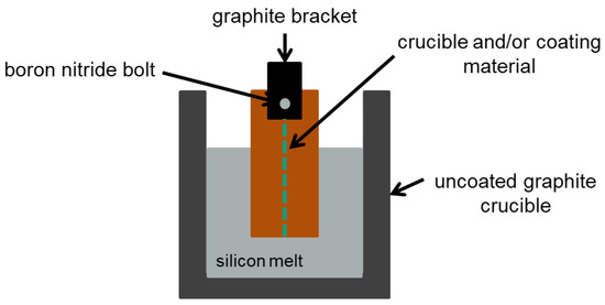 The setup of the dipping experiments is described in Figure 1. In a first step, high purity silicon feedstock was melted in uncoated graphite crucibles (Ø 97/87 × 122 mm). The ratio of weighted silicon portion to the dipped surface of the NSN and graphite samples was chosen in that way, that it corresponds to the ratio of silicon volume to crucible contact area in an industrial scale 32-inch Cz crucible setup. For CVD Si3N4-coated graphite samples, the ratio was doubled due to the only one-side coating.