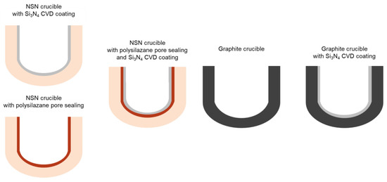 Besides the systematic investigation of the interaction with liquid silicon at small sample scale, the novel crucible setups were also tested in laboratory scaled DS silicon growth experiments. Therefore, crucibles (Ø 121.5/106.5 × 110 mm) with a spherical bottom design in various configurations were prepared to evaluate their potential for Cz application (see Figure 2).
