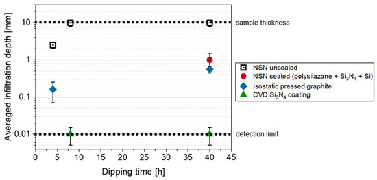 For investigation of the infiltration behavior of liquid silicon in the coating and crucible materials at long time scale, dipping experiments with a variation of contact time to the silicon melt (4 h up to 40 h) were performed. Among others, this is important, hence the Si infiltration in C-based materials results in a silicon carbide (SiC) formation inducing a volume increase, which can lead to an intense crack formation in graphite materials with minor mechanical strength [19,22]. The resulting averaged infiltration depth, which was measured at vertical cross-sections through the various kinds of dipped samples, is summarized in Figure 3.