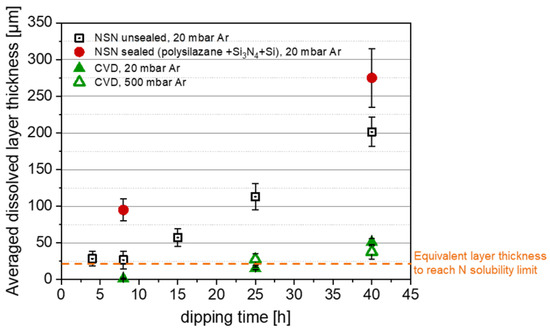 In contrast to the NSN material, the CVD Si3N4 coating exhibits a significant weaker material dissolution (see Figure 5), which predestines the CVD coating as ideal crucible functional surface coating. In case of 8 h of melt contact, the averaged dissolved layer thickness is in the range of the detection limit of 10 µm and increases with increasing dipping time to 25 µm for 25 h and 50 µm for 40 h. This decelerated dissolution behavior compared to NSN can be connected to the high density and exceptionally low open porosity of the CVD Si3N4, of which properties have already been proposed to reduce dissolution in silicon melt [23]. Also at higher Ar pressures, in this case at 500 mbar (see Figure 4), the dissolution process of CVD Si3N4 is rather slow. This could be beneficial if the Ar pressure during the Cz process will be set to higher values (combined with the addition of nitrogen in the atmosphere), in order to increase the chemical stability of the Si3N4 [17].