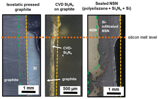 Vertical cross-section of isostatic pressed graphite samples, uncoated as well as with CVD Si3N4 coating, and sealed NSN dipped in liquid silicon for 40 h. The orange dotted line marks the silicon melt level. The yellow dashed line represents the original sample surface and indicates the dissolution of material during melt contact. The green dot dashed line marks the silicon infiltration zone.