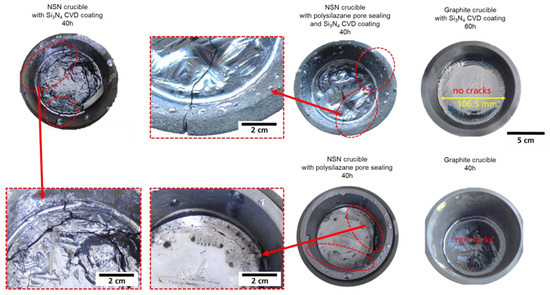 NSN and graphite-based crucible systems with silicon crystals after DS crystallization experiments with melt holding times of 40 h and 60 h. The red marks indicate crack formation in the crucible and the crystal.