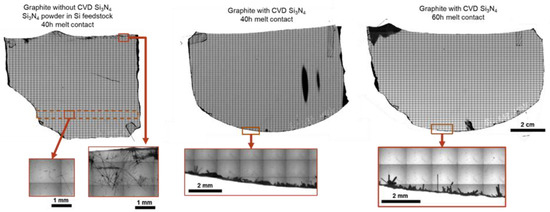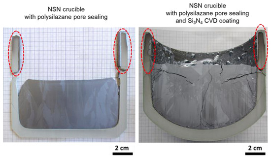 As shown in Figure 6, the visual inspection after the crystallization process of the graphite-based crucibles, with and without CVD coating, shows no obvious crack formation or deformation. Despite, the graphite material has a higher CTE (~4.1 × 10−6 K−1) than the NSN/CVD materials, and in consequence, the CTE mismatch between crucible and the solidified Si is larger in this case; the mechanical strength of the used graphite material is sufficient to withstand the thermal stresses.