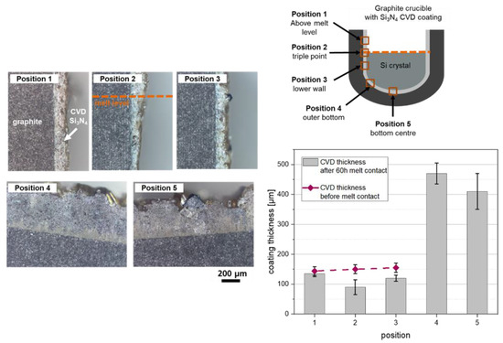 To evaluate the dissolution of CVD Si3N4 coating during the crystallization experiments, a vertical cross-section of one coated graphite crucible (60 h melt contact) was prepared from various positions along the crucible wall and bottom. After removing the attached silicon by an etching process, the thickness of the still present CVD coating was measured (Figure 8).